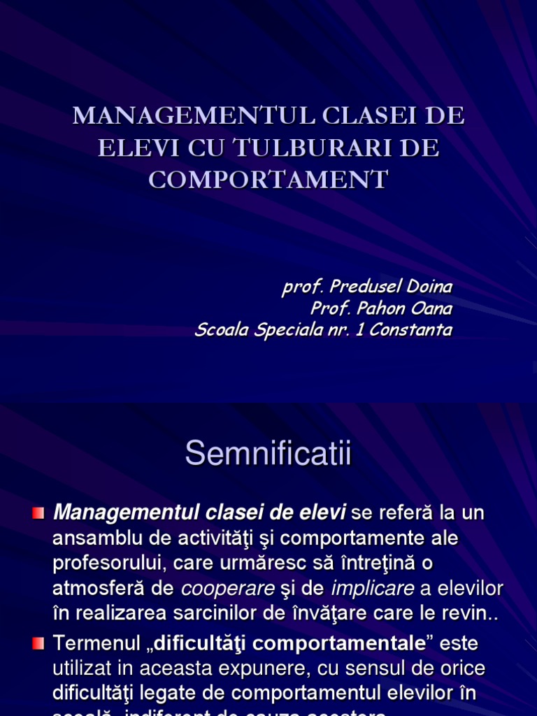 vizitati articolul complet aici : https://www.slideserve.com/gaurav/managementul-clasei-de-elevi Preocuparea profesorilor pentru problemele de disciplină este prezentă și în statele unite, o arată diferite statistici și sondaje. Reacţii nu au venit nici din partea parlamentarilor din comisiile de cultură sau pentru educație dar nici din partea ministerului educației. O atentie deosebita trebuie acordata elevilor slabi si nemotivati.